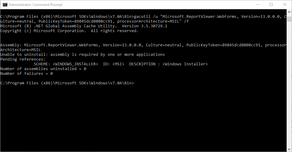 gacutil /u "Microsoft.ReportViewer.WebForms, Version=13.0.0.0, Culture=neutral, PublicKeyToken=89845dcd8080cc91, processorArchitecture=MSIL" /f gacutil /u "Microsoft.ReportViewer.WinForms, Version=13.0.0.0, Culture=neutral, PublicKeyToken=89845dcd8080cc91, processorArchitecture=MSIL" /f gacutil /u "Microsoft.ReportViewer.WebDesign, Version=13.0.0.0, Culture=neutral, PublicKeyToken=89845dcd8080cc91, processorArchitecture=MSIL" /f gacutil /u "Microsoft.ReportViewer.Common, Version=13.0.0.0, Culture=neutral, PublicKeyToken=89845dcd8080cc91, processorArchitecture=MSIL" /f