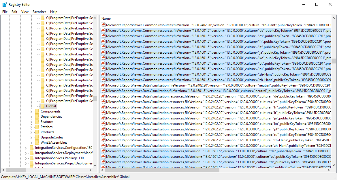 No meu computador, eu encontrei as referências na pasta “HKLM\SOFTWARE\Classes\Installer\Assemblies\Global“. Porém, pode ser que em algumas instalações as referências estejam em “HKCU\Software\Microsoft\Installer\Assemblies\Global“, portanto, é importante procurar nessas duas pastas do registro. Uma vez encontradas as chaves do Report Viewer, delete tudo o que tiver versão “13” (não esqueça de fazer um backup do registro antes de deletar as chaves!):