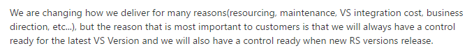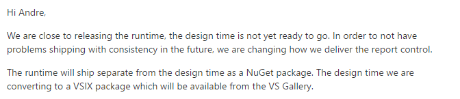 Para tentar diminuir esse stress (entre outras coisas, como custos com recursos, manutenção, estratégias do produto, etc), a nova metodologia de distribuição fará com que as releases do controle do Report Viewer não estejam mais atreladas às releases do Visual Studio. Ou seja, nós não vamos mais precisar esperar que uma nova versão do Visual Studio seja lançada para podermos utilizar as novas versões do controle e do designer do Report Viewer.