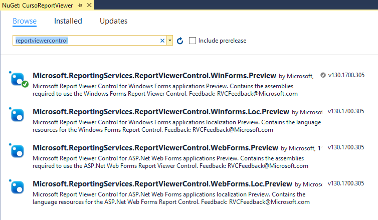 A primeira versão de testes do controle do Report Viewer 2016 foi lançada no dia 20 de setembro. Tanto o controle Windows Forms quanto o controle Web Forms estão disponíveis através de um pacote do NuGet. Para instalar o pacote, abra a janela de gerenciamento de pacotes do NuGet e procure por “reportviewercontrol“:
