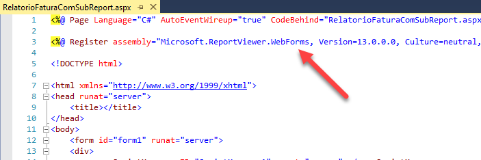 Para projetos web, se você já utilizava uma versão anterior do controle do Report Viewer, você terá que alterar algumas referências, apontando para a versão mais nova do controle (13.0.0.0). O primeiro lugar que você tem que alterar é a tag “Register” na página onde você utiliza o controle do Report Viewer: