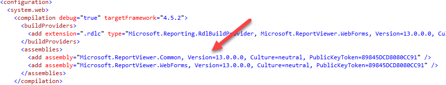 <assemblies> <add assembly="Microsoft.ReportViewer.Common, Version=13.0.0.0, Culture=neutral, PublicKeyToken=89845DCD8080CC91" /> <add assembly="Microsoft.ReportViewer.WebForms, Version=13.0.0.0, Culture=neutral, PublicKeyToken=89845DCD8080CC91" /> </assemblies>