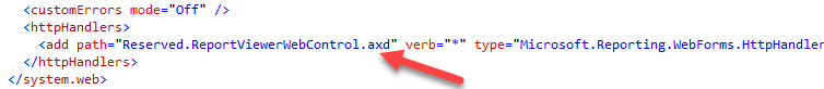 <httpHandlers> <add path="Reserved.ReportViewerWebControl.axd" verb="*" type="Microsoft.Reporting.WebForms.HttpHandler, Microsoft.ReportViewer.WebForms, Version=13.0.0.0, Culture=neutral, PublicKeyToken=89845DCD8080CC91" validate="false" /> </httpHandlers>
