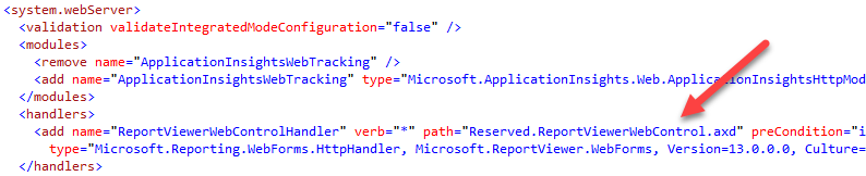 <handlers> <add name="ReportViewerWebControlHandler" verb="*" path="Reserved.ReportViewerWebControl.axd" preCondition="integratedMode" type="Microsoft.Reporting.WebForms.HttpHandler, Microsoft.ReportViewer.WebForms, Version=13.0.0.0, Culture=neutral, PublicKeyToken=89845DCD8080CC91"/> </handlers>